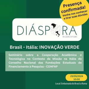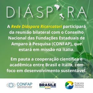No dia 23 de maio de 2024, a Embaixada Brasileira em Roma será o palco de um significativo encontro entre a Rede Diáspora Ricercatori e o Conselho Nacional das Fundações Estaduais de Amparo à Pesquisa (CONFAP), que estará em missão na Itália. Este evento também englobará um seminário focado na promoção da cooperação científica entre Brasil e Itália, explorando novas oportunidades e incentivos para o desenvolvimento sustentável.